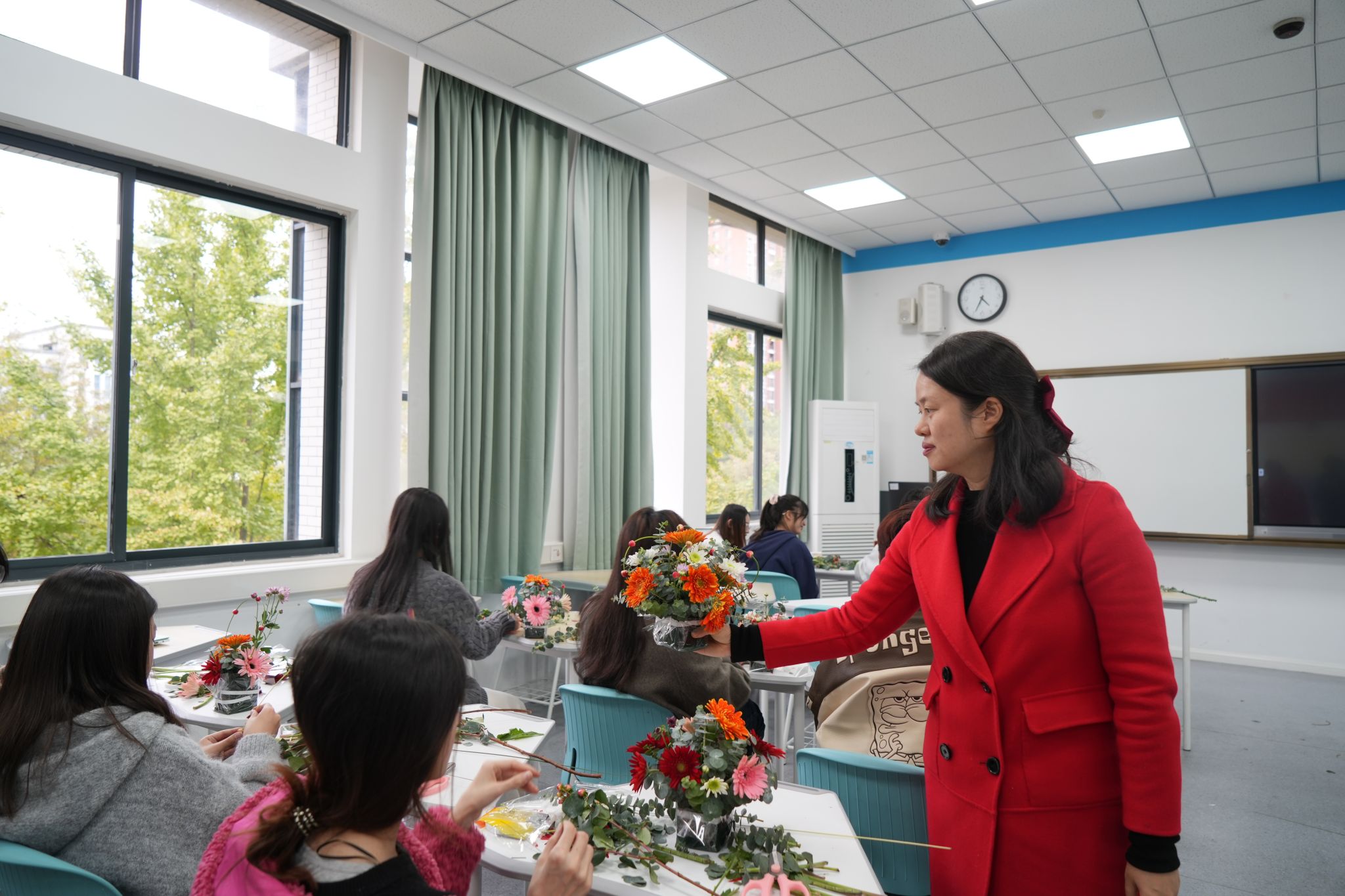 讲座邀请四川农业大学风景园林学院副教授杜娟担任主讲人。杜娟老师重点讲解了插花的三大艺术类型,日常插花花材的识别与花语,并带领同学们实操创作现代花艺作品。在实践环节,同学们在老师指导下动手包装花泥、裁剪花枝、运用插花技巧制作花束,体验插花艺术的乐趣。