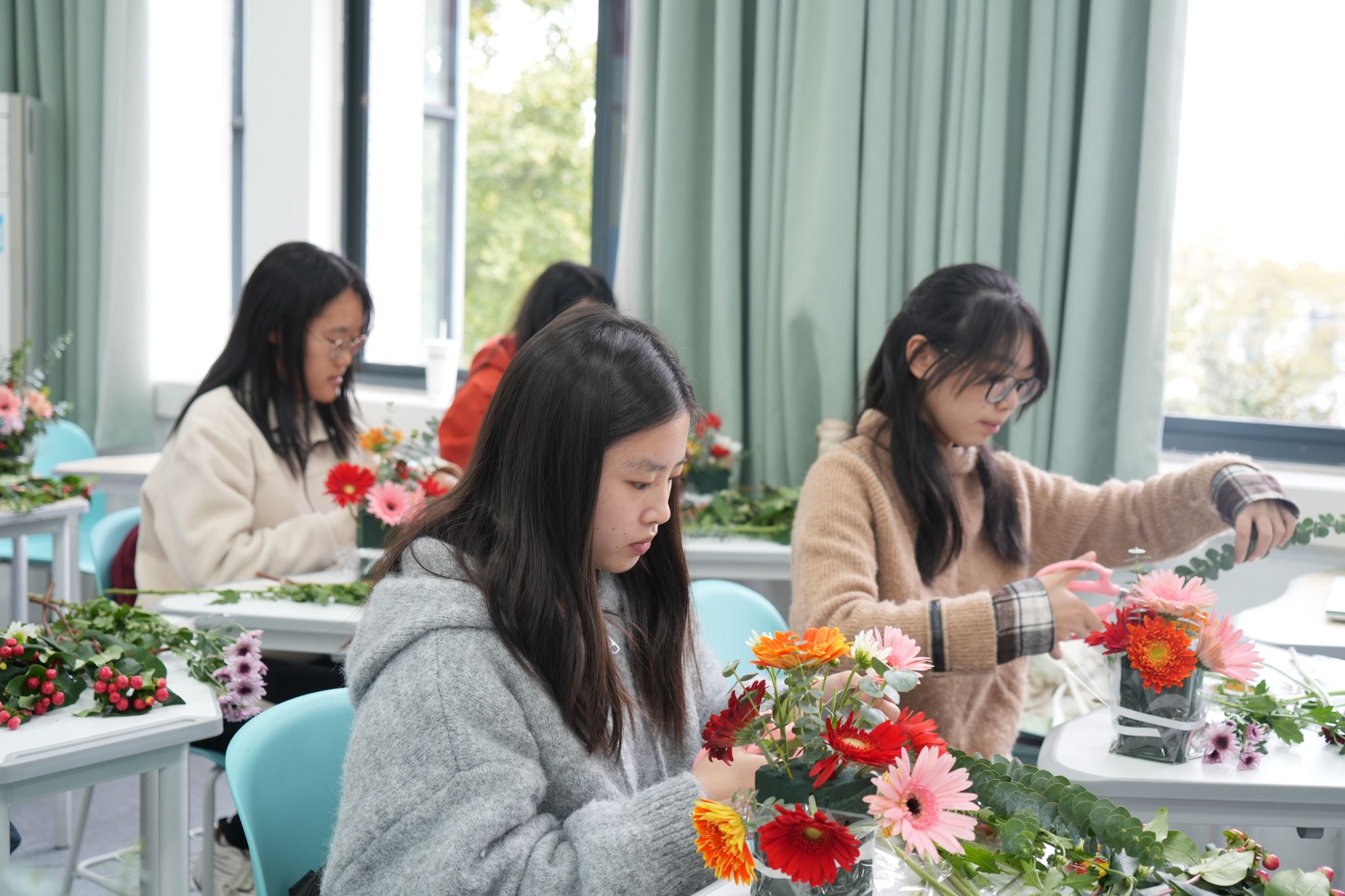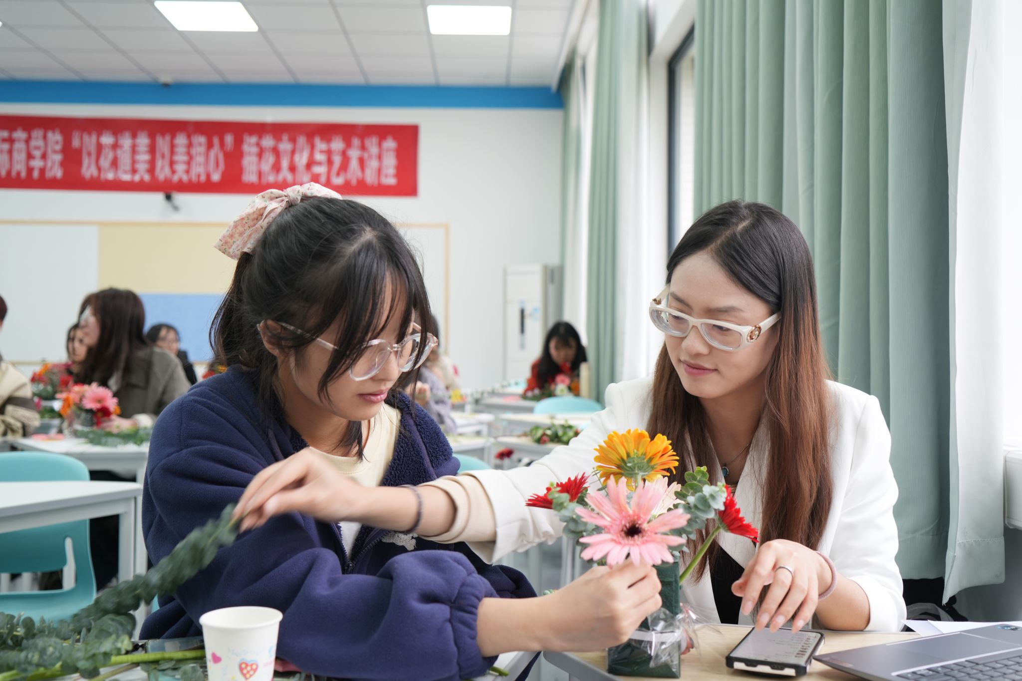 通过对插花技艺的学习,同学们收获颇丰。2023级国际经济与贸易(双语实验班)宋心雨同学谈到:“非常开心能够参加此次活动,在这短短的时光里,我们随老师一同在插花的世界中畅游,感受花道之美。每一枝花的裁剪、每一次位置的摆放,都是我们与自然对话、与内心交流的过程,让我对插花文化有了更深的了解与热爱。”