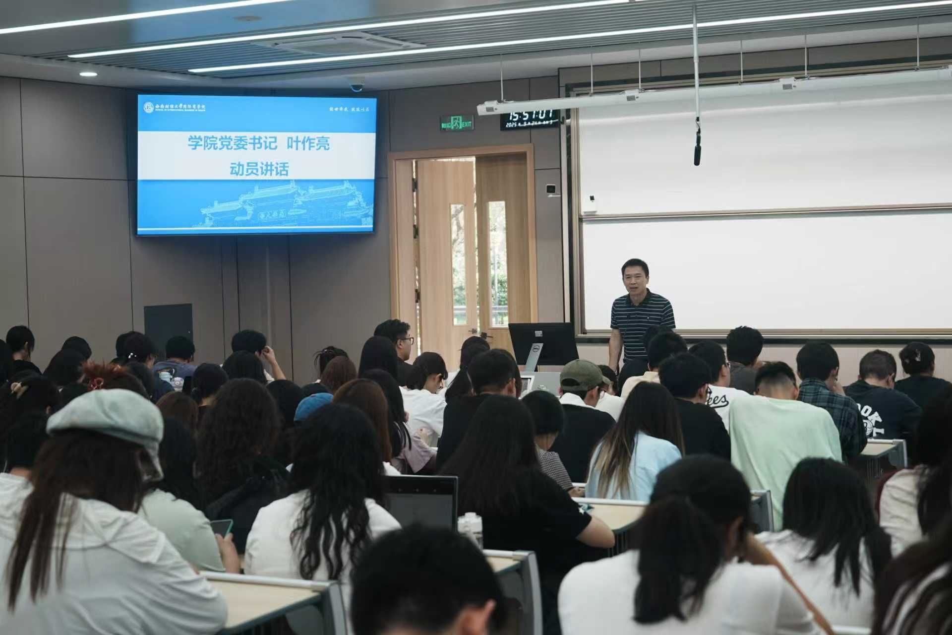 为扎实推进2026届毕业生就业指导与服务,9月24日,国际商学院在经世楼E102组织召开2026届本科毕业生就业动员大会。学院党委书记叶作亮、学校学生职业规划与就业指导中心教师周瑞、学院就业工作专项负责人罗小艳、教学秘书项旎、辅导员姜鉴涛以及2026届全体本科毕业生参会。