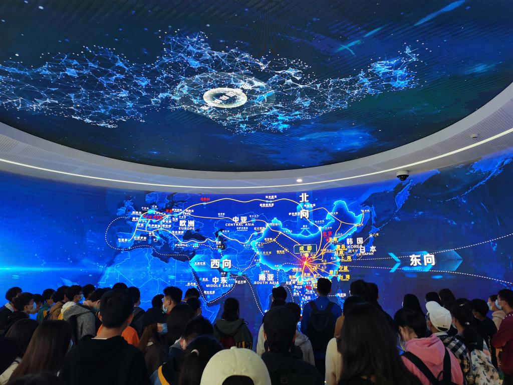 铁路港管委会工作人员对yl7703永利集团师生的到来表示热烈欢迎,随后通过观看宣传片、实地走访参观以及互动交流等方式让大家对成都国际铁路港有了更进一步的了解。在老师的讲解中,同学们也从经济与贸易的角度了解了铁路港的诞生背景、发展现状以及未来目标。成都铁路港从2013年至今,已连接境外意大利米兰、德国汉堡、匈牙利布达佩斯、白俄罗斯布列斯特等25个城市,钦州、上海等境内14个城市,打造了7条国际铁路通道和5条国际铁海联运通道,铁路港正一步一步向着“国际内陆第一港”迈进。铁路港本身的建设也让大家耳目一新,风情各异的国家馆多样的商品以及建筑本身给大家留下了深刻的印象。