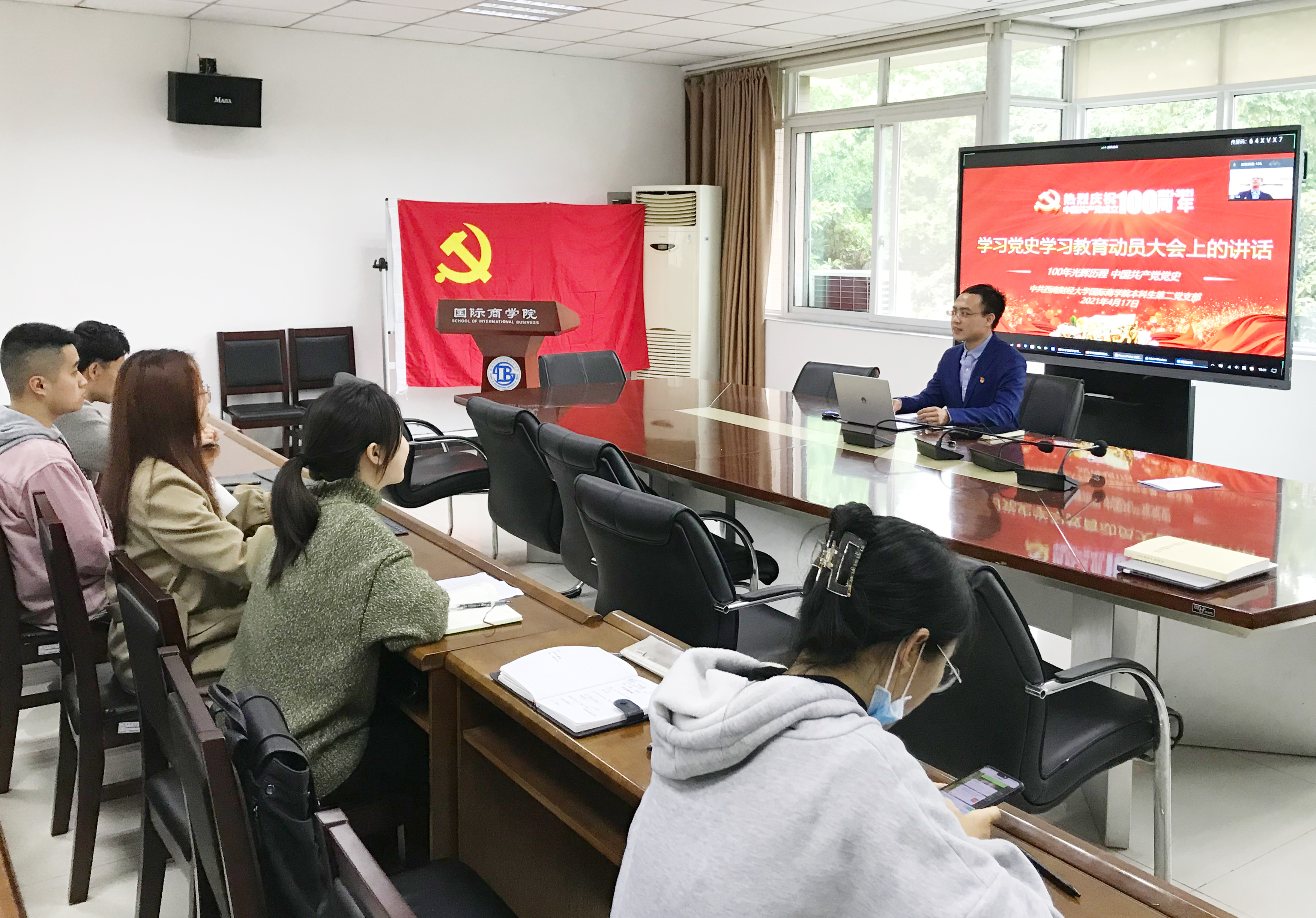 4月17日下午,国际商学院本科生第二党支部书记彭举为支部党员们讲授党史学习教育专题党课。